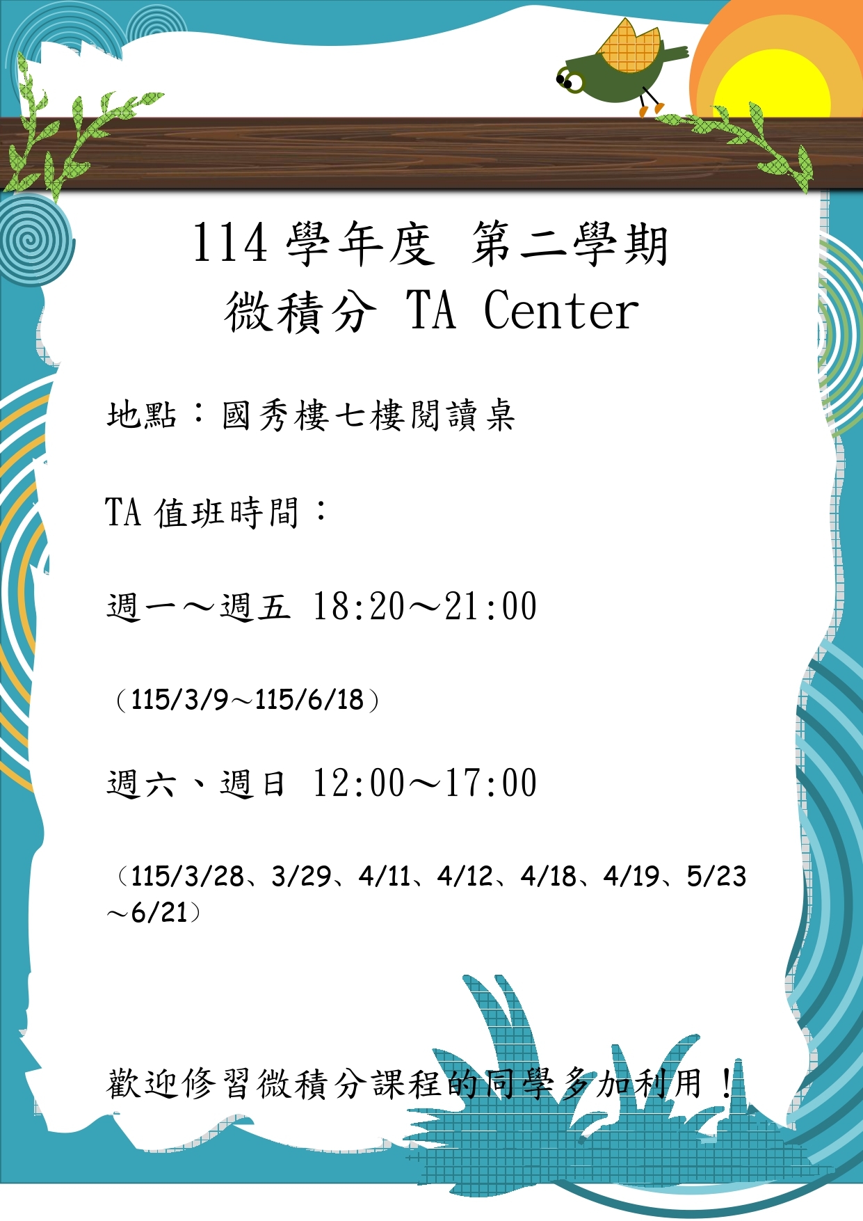 114學年度第二學期微積分TA值班表,歡迎同學多多來請益